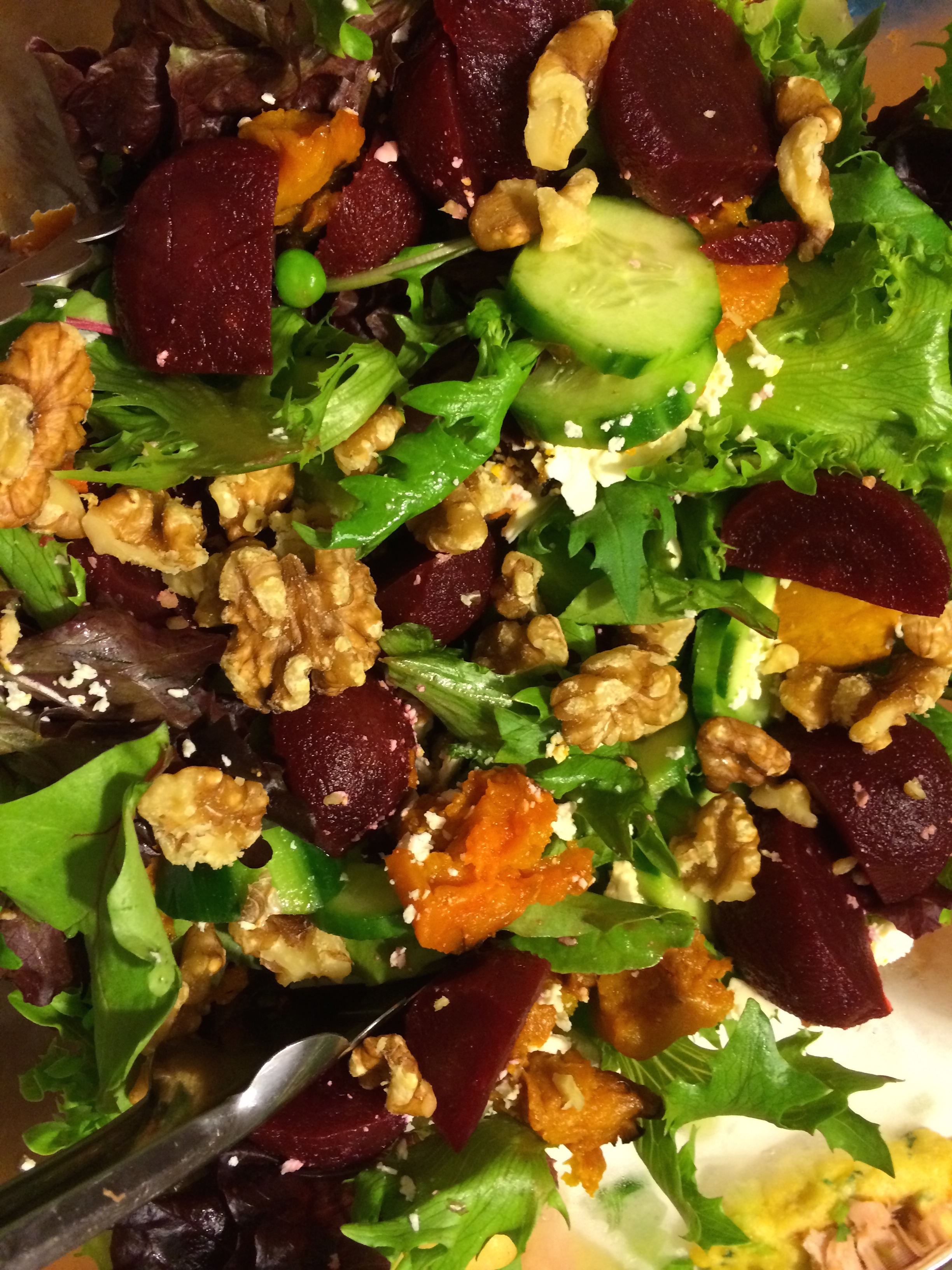 IMG_3290 Quick and easy salad using washed ready to eat leaves, tinned baby beets, leftover roast pumpkin and crumbled feta (OK to have on hand from the freezer) and walnuts Share this:TwitterEmailFacebookPinterestWhatsAppLike Loading...
