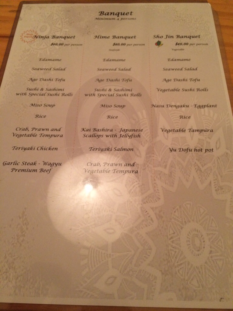 Iori has been around for 14 years and has featured previously in Canberra’s Top Restaurant lists. Service is professional and personal. Director Mamoru is ‘hands on’ and friendly and chats with diners. He assured me that he tries to be as flexible as possible. This was true as we were able to swap the Miso Soup in the Ninja Banquet for Nasu Dengaku – Eggplant.
