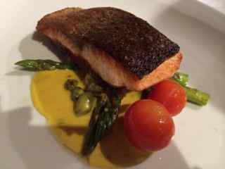 Salmone Infornato Crispy skin Atlantic Salmon served on grilled asparagus and truss tomato $27