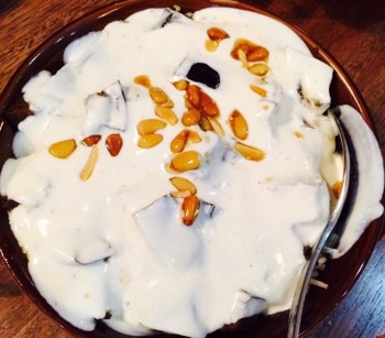 Lamb Fatteh $25, Chicken Fatteh $25 or Petra Fatteh $18 – casserole of marinated chicken/chargrilled eggplant, crispy Lebanese bread, spiced rice, garlic, mint, yogurt and tahini topped with pie nuts.