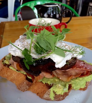 ….smashed avocado, mushroom, bacon, poached eggs and toast $18…