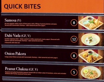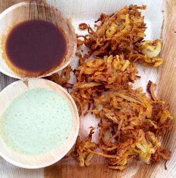 Other options are the Onion Pakora $8 – crispy onion fritters with tamarind chutney and mint yogurt