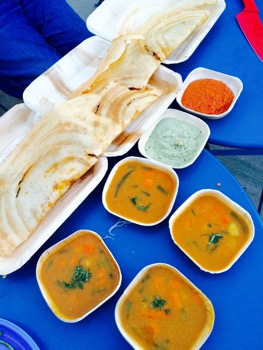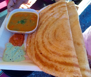 A generous serving of two dosa with coconut and tomato chutneys and the very good sambar is $14.