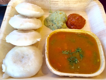 Idli Sambar $10 – steamed rice and lentil cakes served with coconut and tomato chutneys and sambar – a spiced lentil and vegetable stew.