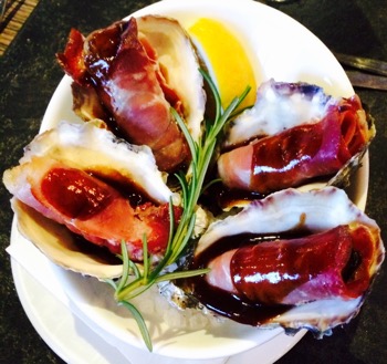 Baked Coffin bay oysters wrapped in proscuitto and BBQ sauce $16