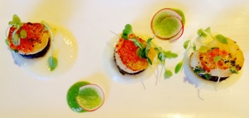 Pan seared scallops with black pudding and cauliflower espuma and salmon caviar (very good) $16