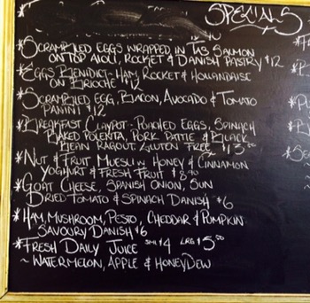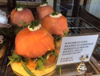 ….. the Scrambled Eggs wrapped in Tasmanian Smoked Salmon with rocket and aioli on a Danish Pastry ($12) is fantastic.