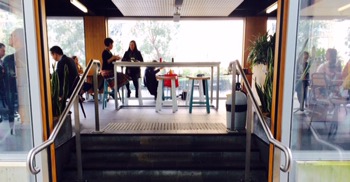 The atmosphere is good for a workplace cafe especially up the stairs.