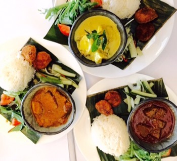 Kari Ayam Chicken thigh cooked in coconut gravy w/ Pickles, croquettes, salad & rice