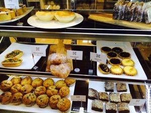 There are also delicious sounding sandwich options like a BLT with dijonaise on handmade caramelised garlic bread $14, Salmon Bagel with cream cheese, dill and capers $12.50, Grilled vegetables with fresh rocket, tomato and olive tapenade on dark artisan rye $9.50.