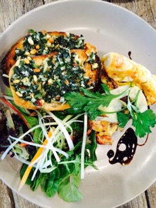 Smoked Trout Roesti ($18.50), Grilled Field Mushrooms with a cress and rocket salad, toasted pearl barley, feta and salsa verde ($16.50), Swey crepes served with passionfruit curd, fresh strawberries, toasted coconut ice-cream and spring flowers ($16.50).